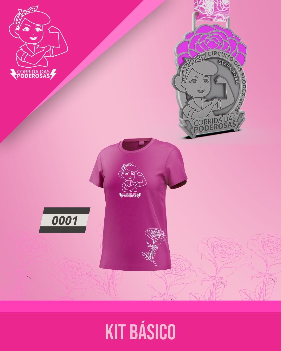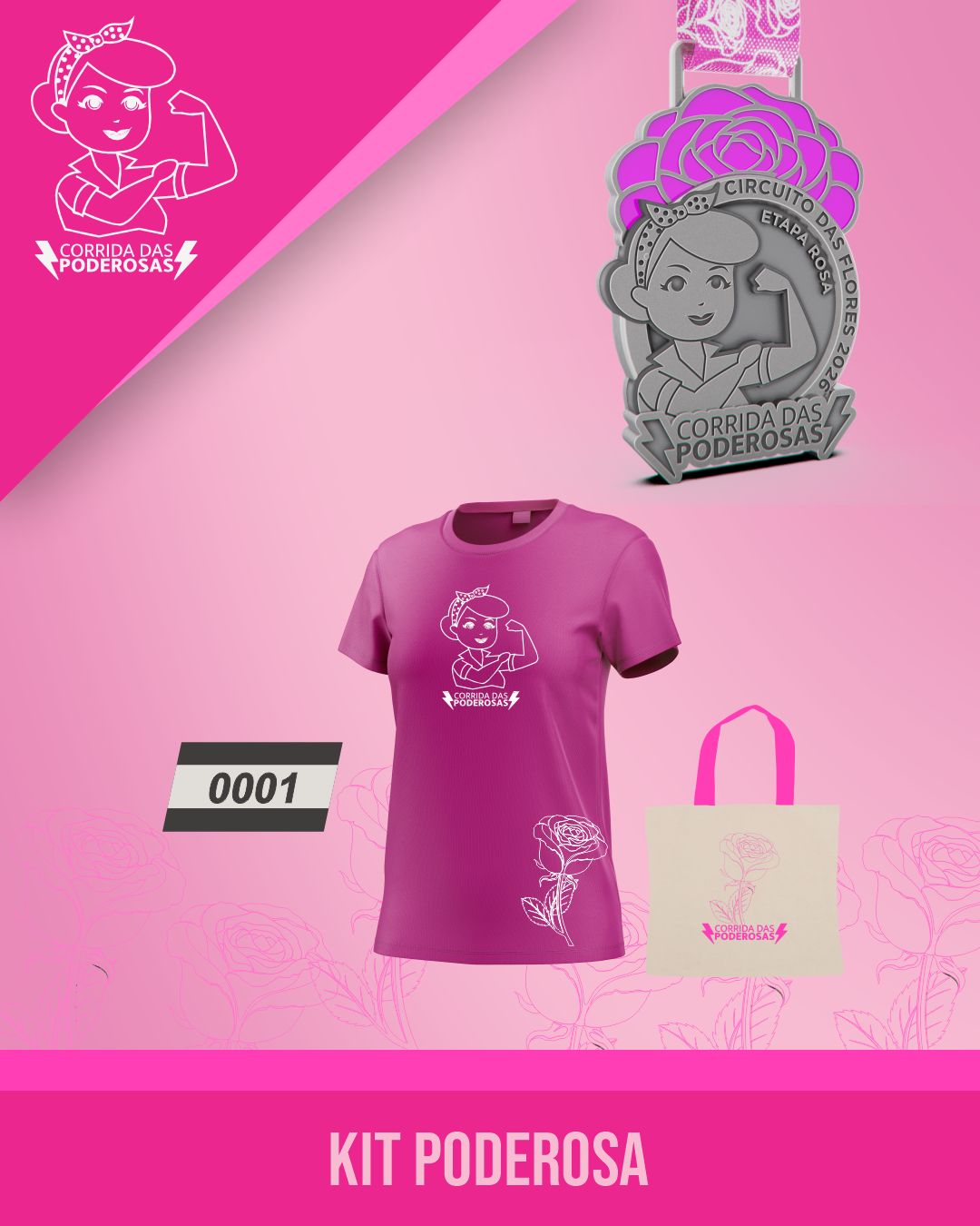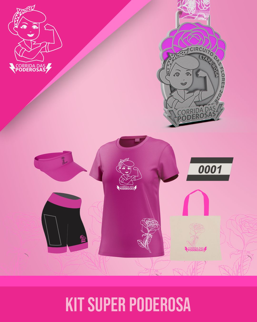 KIT SUPER PODEROSA: (Camisa, bermuda, bolsa, viseira, número de peito, chip e medalha pós prova)